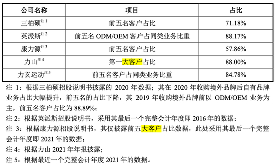但事实上英派斯2017年已经在深圳主板上市交易,每年的业绩报告都是公开可查阅的。而据英派斯2021年财报,公司前五客户的销售占比为35.76%,与力玄运动用做对比的88.17%相去甚远。