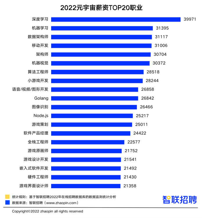 智联招聘数据显示,2022年1-7月全平台元宇宙相关岗位的平均招聘薪酬为18515元/月。深度学习、机器学习、数据架构师、移动开发、机器视觉等岗位,平均薪酬均超过3万元,深度学习更以39971元/月位列榜首。