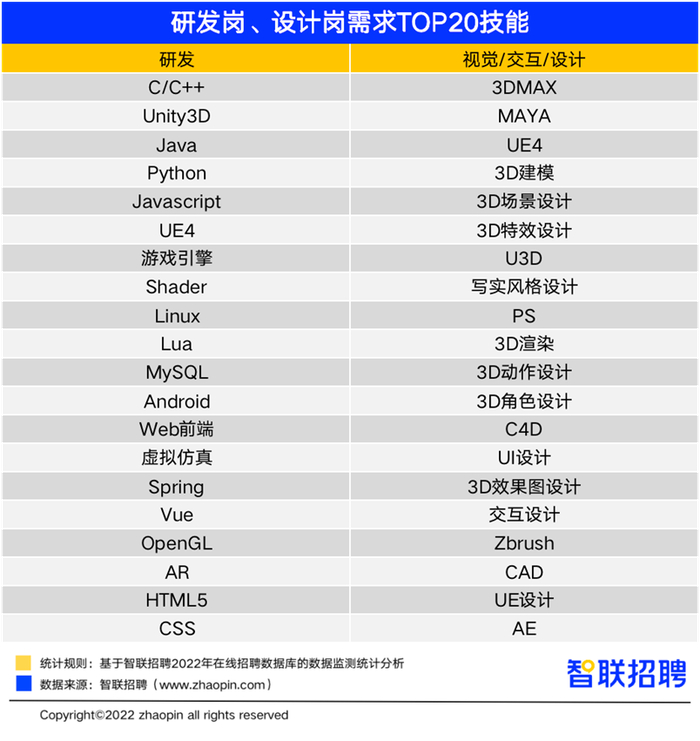 研发岗位中,招聘方所看中的技能排行前列的为C/C++、Unity3D(U3D)、Java、Python,基本为程序员“通用技术”。而设计岗则更需要3DMAX、MAYA、UE4、3D建模等方面的人才。