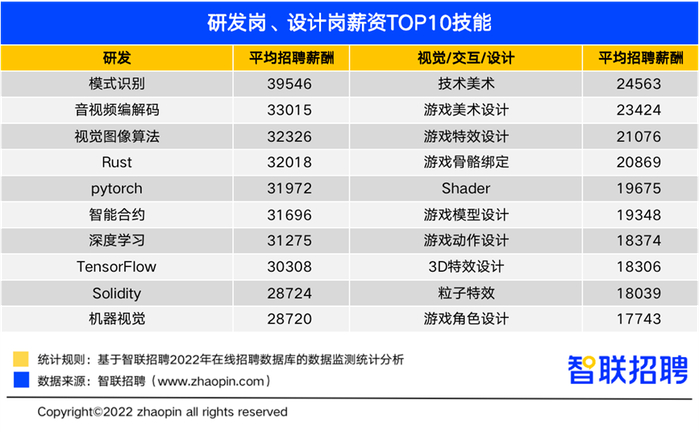 对于设计岗而言,“技术美术”“游戏美术设计”“游戏特效设计”“游戏骨骼绑定”分别以超2万元/月的平均招聘薪酬名列前四。在薪资TOP10技能中,有超过半数的技能均涉及游戏领域。其中,排行第一的技术美术是程序与美术的桥梁,“得技术者得高薪”效应明显。