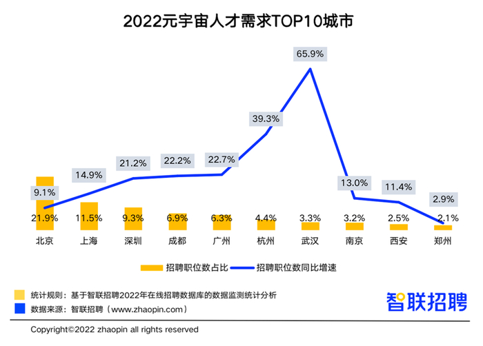 在地域分布上,元宇宙人才的需求主要集中在一线及新一线城市,其中北京、上海、深圳位居前三,招聘职位数占比分别为21.9%、11.5%及9.3%。受政策扶持等因素影响,新一线及二线城市均呈现出强劲增势,今年1-7月职位数同比增速为22.4%及19.0%,超过一线城市职位数增速。