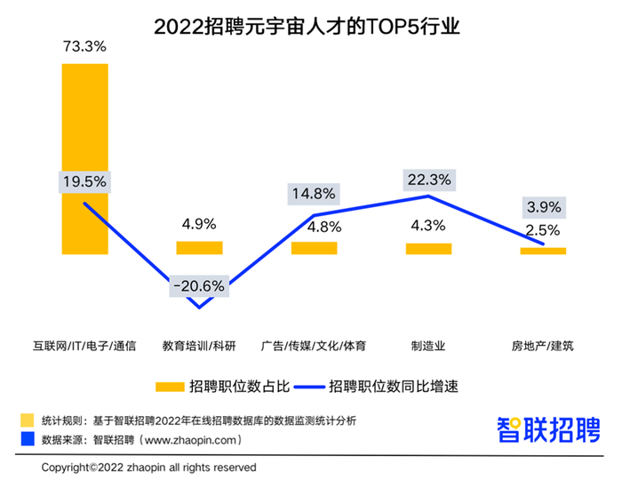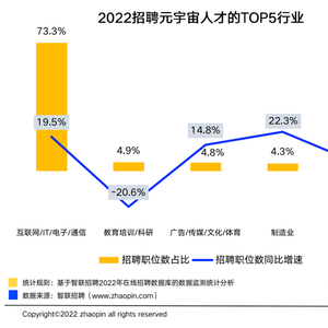 智联招聘数据显示,2022年1-7月全平台元宇宙相关招聘职位数同比增长16.6%。分行业看,招聘元宇宙人才的TOP5行业为互联网/IT/电子/通信(职位数占比73.3%)、教育培训/科研(4.9%)、广告/传媒/文化/体育(4.8%)、制造业(4.3%)、房地产/建筑(2.5%)。可见,当前国内元宇宙技术的应用仍高度集中在信息技术产业本身,整体仍处于初期发展阶段。