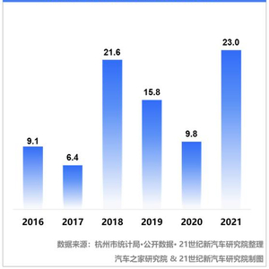 感受到先行者风险的杭州,后来并未成为我国新能源汽车的重镇。2020年,杭州新能源汽车产量仅有9200余辆,2021年,杭州新能源汽车产量增至2万辆。