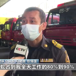 消防队分队长 马诺普·坎塔蓬:今年的蛇比往年都要多,抓蛇占到我全天工作的80%到90%。
