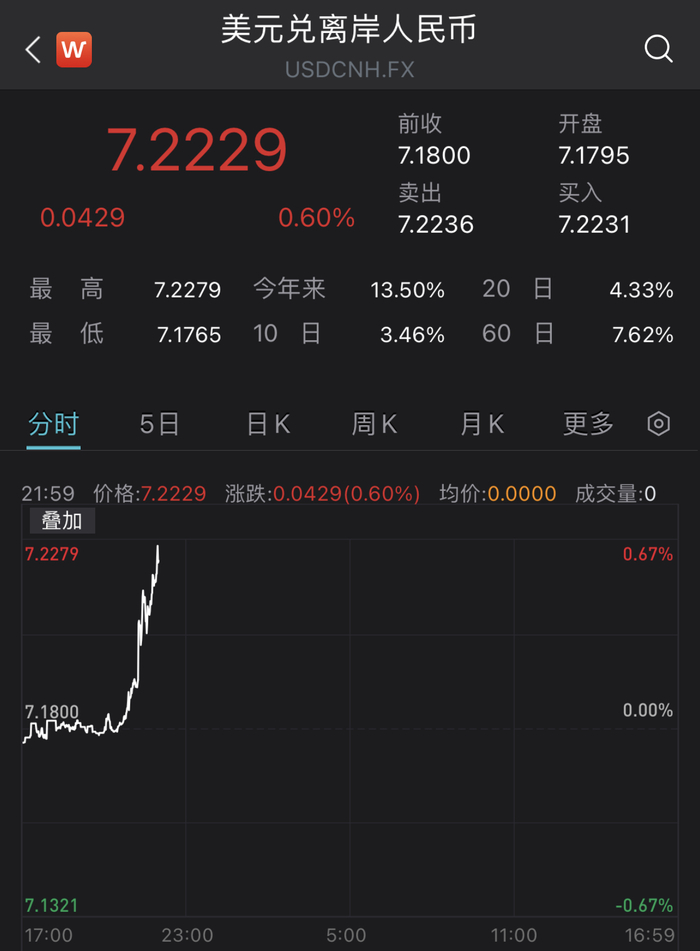 在中间价出炉后,更多反映国际投资者预期的离岸人民币对美元汇率随即跌破7.2关口,随后进一步跌破7.21和7.22关口,日内下跌超过400点,截至发稿,最低至7.2279。