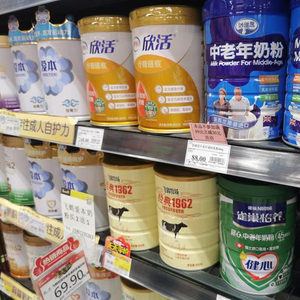 新京报记者近日走访北京一家永辉超市看到,中老年奶粉目前已有单独陈列货架,伊利“欣活”、雀巢“怡养”、圣元“荷兰乳牛”、飞鹤“经典1962”“爱本”、妙维思等中老年奶粉品牌均在抢滩商超渠道,700克以上单罐产品售价在86元-248元不等。其中伊利、雀巢、飞鹤同时推出袋装、罐装、礼盒装中老年奶粉,飞鹤“爱本”系列还打出“买2赠1”活动并有礼品赠送。