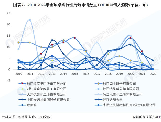 趋势方面,2010-2021年,全球前十大染料专利申请人中,浙江龙盛及其关联公司申请的染料专利数均较多。