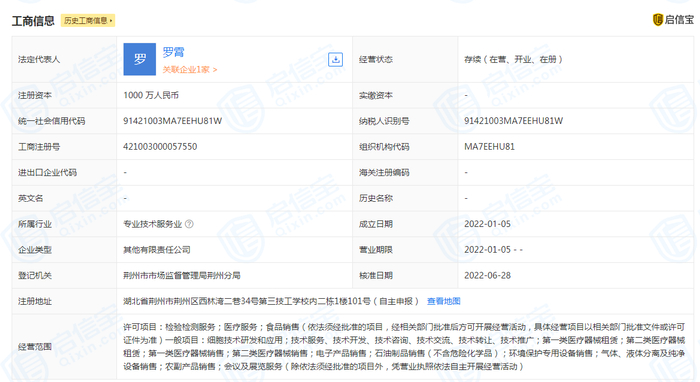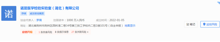 启信宝显示,诺翌医学检验实验室(湖北)有限公司成立于2022年1月5日,法定代表人系罗霄,注册资本1000万元,主要从事检验检测服务;医疗服务;食品销售等经营活动。