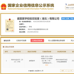据国家企业信用信息公示系统网站消息,近日,诺翌医学检验实验室(湖北)有限公司(下称当事人)因虚假宣传,被荆州市荆州开发区市场监督管理局罚款5万。