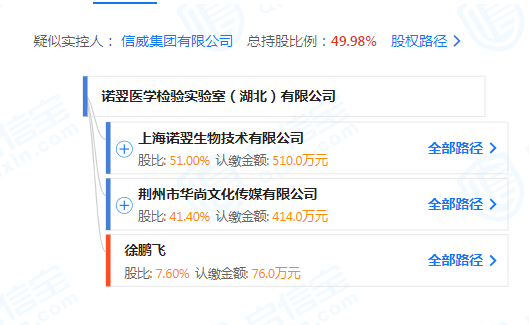 诺翌医学检验实验室(湖北)有限公司的股权结构图显示,上海诺翌生物技术有限公司持股51%。