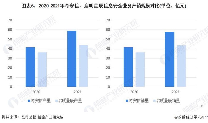 2020-2021年,奇安信信息安全业务的产销规模较启明星辰略胜一筹。尤其是2021年,两家企业的产量差距从5.1亿元上升至15.0亿元,销量差距从5.3亿元上升至14.2亿元。
