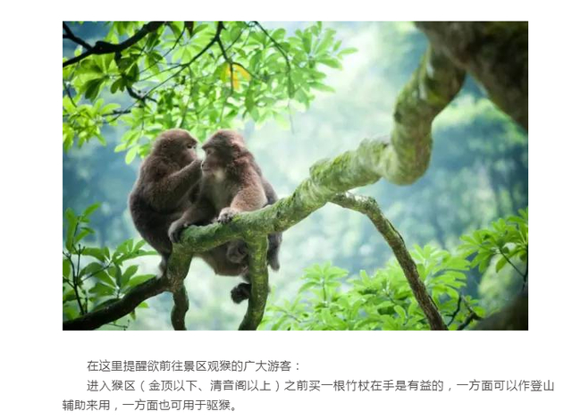 上述提到的公众号中,一篇文章曾有提示:进入猴区(金顶以下、清音阁以上)之前买一根竹杖在手是有益的,一方面可以作登山辅助来用,一方面也可用于驱猴。游客千万不可主动攻击猴子,游山本是陶冶情操的雅事,万不可把雅事做俗。特别要注意的是,喂饲猴子的食物要事先拿在手上,切不可当着它们的面从背包或衣服中拿出来。