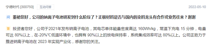 而宁德时代今年5月在互动平台表示,公司2021年发布钠电池,其电芯单体能量密度高达160Wh/kg,常温下充电15分钟,电量可达80%以上。公司正致力于推进钠电池在2023年实现产业化。