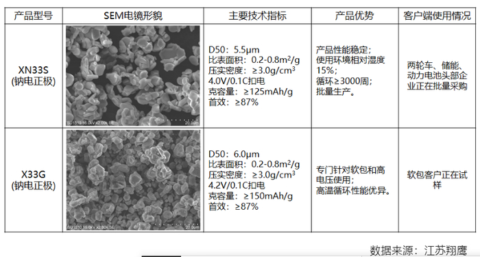 江苏翔鹰称,其年产3000吨的钠电池层状氧化物正极材料于9月1日正式投入生产,并于9月中旬大批量供货。目前,公司已向130家单位送样和发货,发货量10吨左右。产品加工性能、循环性能、抑制胀气等性能优异,性价比较高。