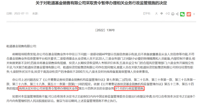 梳理发现,2022年7月11日,北京证监局对乾道基金处以“暂停办理相关业务3个月”的行政监管措施。