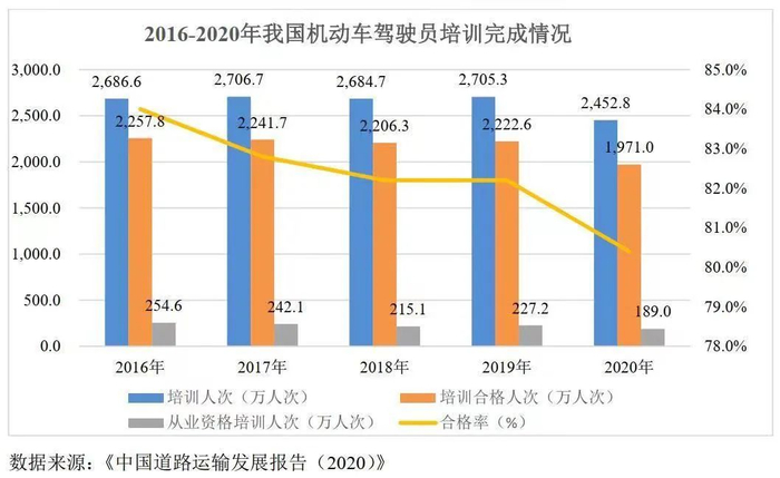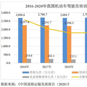 2017年-2021年,中国机动车驾驶员培训人次分别为2706.7万、2684.7万、2705.3万、2452.8万、2399.0万。尽管2020年-2021年的下滑有疫情影响的因素,但长期来看,增速下滑,也是不争的事实。