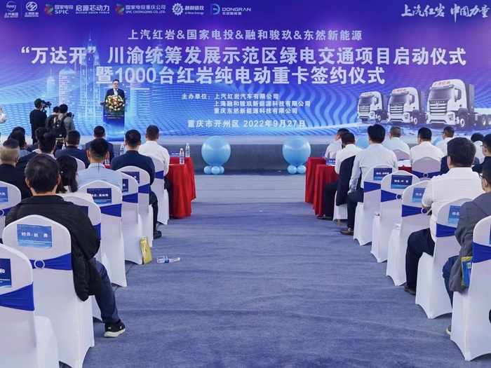 为响应国家政策,推动“万开云”同城化、“万达开”(万州、达州、开州)一体化发展,9月27日,由上汽红岩、国家电投、东然新能源三方联合举办的“万达开”川渝统筹发展示范区绿电交通项目启动仪式暨1000台红岩纯电动重卡签约仪式在重庆开州举行。