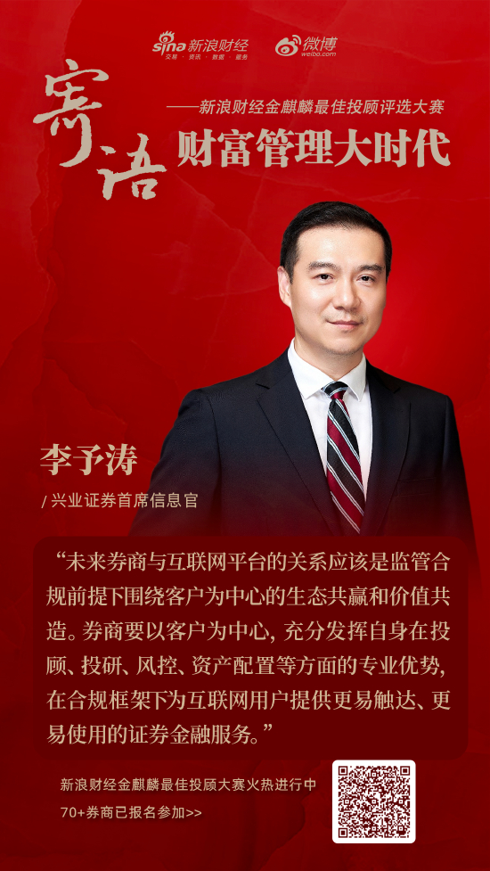 兴业证券首席信息官李予涛受邀成为本次大赛的评审委员会成员之一。他认为,券商要以客户为中心,充分发挥自身在投顾、投研、风控、资产配置等方面的专业优势。在财富管理转型的新时代,坚持买方投顾定位,加强平台化、数智化、场景化建设赋能,彰显专业能力。为客户提供更易触达、更易使用的证券金融服务,创造财富价值。预祝“2022首届新浪财经·金麒麟最佳投资顾问评选”活动成功举办,共同探索多层次的生态共建。