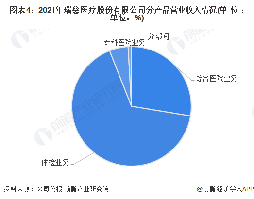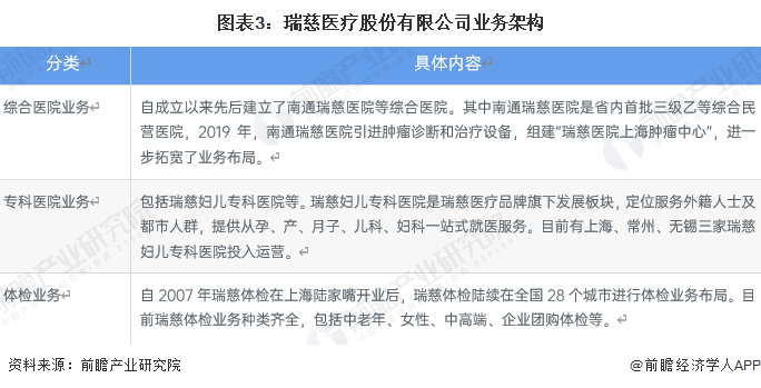 瑞慈医疗的业务内容包括综合医院、专科医院、健康体检等板块,形成一个医疗产业链。在综合医院业务板块,瑞慈医疗先后建立了南通瑞慈医院等综合医院,并于2019年组建了“瑞慈医院上海肿瘤中心”。在专科医院业务板块,主要布局在华东地区。体检业务板块为瑞慈医疗的核心服务业务,目前已在全国28个城市进行体检业务布局,处于国内领先地位。