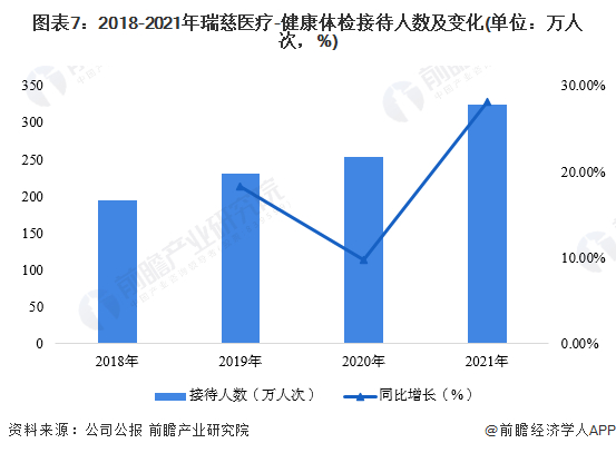 2018-2021年,瑞慈医疗健康体检接待人数呈波动增长态势。2020年受新冠疫情影响,接待人数增速有所放缓。截至2021年底,瑞慈医疗健康体检接待人数达324.38万人次,较上年度同期增加28.1%。