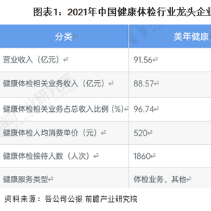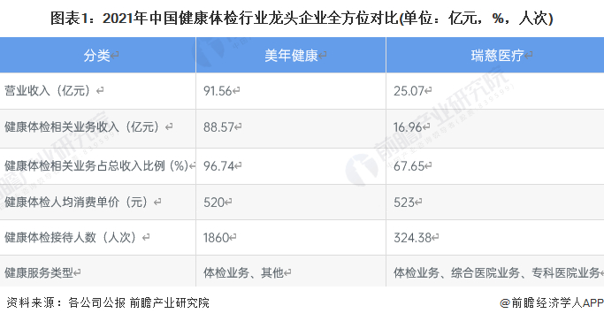 健康服务业以医疗服务机构为核心,以保健用品/药品、医疗器械、诊断试剂/检测服务为支撑产业,以商业医保/商业养老保险、药事服务、医疗信息、移动医疗、在线教育等为支撑服务系统。健康体检作为健康服务业不可或缺的一环,目前竞争梯队建设较为全面。中国健康体检行业的龙头企业主要包括瑞慈医疗、美年健康等。从营业收入的角度来看,美年健康相应指标的表现较好;从健康服务人均消费单价及服务类型来看,瑞慈医疗表现较强于瑞慈医疗。具体数据如下: