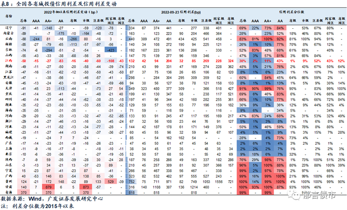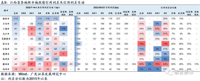 分地级市来看,2022年以来各地级市信用利差均有不同程度收窄,大部分地级市处于历史50%分位数以下。新余市和吉安市信用利差收窄幅度相对较大,在90bp以上。南昌市信用利差收窄幅度最小,仅为18bp,主要与其利差已经压缩到极低的1%分位数有关。其余地级市信用利差收窄幅度在40-85bp。
