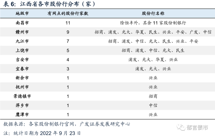 从股份行来看,若在某地设有网点,业务开展会更加便捷,当地城投可能更容易获得信贷及投债的支持,江西省部分城市股份行网点较少。12家股份行中仅恒丰银行未在南昌市设立网点,赣州市和九江市有超过一半的股份行在当地设立网点,股份行资源较丰富。而新余市、抚州市、景德镇市、萍乡市和鹰潭市均只有1家股份行在当地设立网点。
