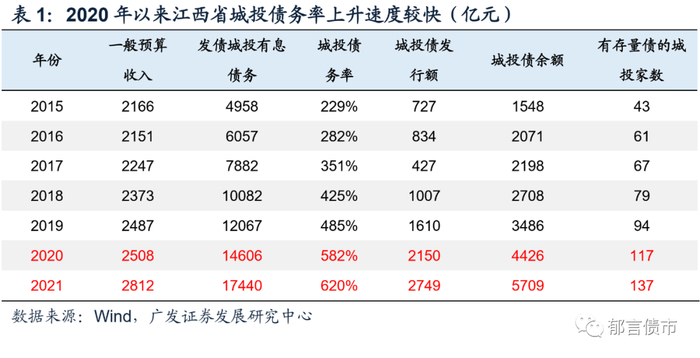 由于江西省2019年开始大力发展直融市场,发债的城投明显增多,2020年首次突破100家,从而导致城投债务率上升速度较快。2019年5月和2020年7月,江西省金融监管局等部门分别印发《关于进一步扩大江西省直接融资规模助力经济发展的若干措施》、《江西省进一步推进企业直接融资行动方案》,明确支持省内企业大力发展直接融资市场。因此,2020年江西省城投债发行额首次突破2000亿元,有存量债的城投首次超过100家。