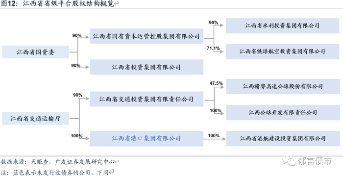 目前江西省本级有8家存量债平台,本次股权划转全部完成后,除江西省港航建设投资集团有限公司(“江西港航”)实控人为江西省交通厅外,其余7家平台实际控制人均为江西省国资委。其中,江西公路开发有限责任公司(“江西公路开发”)、江西赣粤高速公路股份有限公司(“赣粤高速”)、江西港航资产规模较小,在500亿元以下,前两家为江西交投子公司。