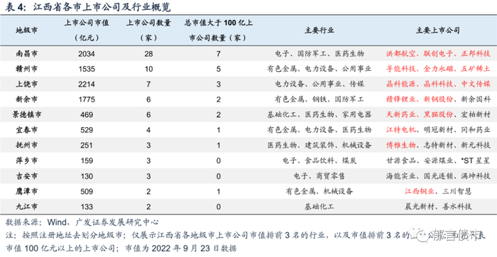 分地级市来看,江西省上市公司主要集中在南昌市。南昌市有28家上市公司,排省内第一,其中7家市值大于100亿元,总市值为2034亿元,排省内第二。南昌市电子、国防军工、医药生物三大行业上市公司市值占全市总市值的35%,其中正邦科技、洪都航空、联创电子等市值靠前。上饶市上市公司总市值达2214亿元,排省内第一,拥有江西省市值最大的上市公司晶科能源。新余市虽然只有6家上市公司,但因为有赣锋锂业,总市值达1775亿元,排省内第三。而抚州市、萍乡市、吉安市、鹰潭市和九江市的上市公司数量较少,仅2-3家。