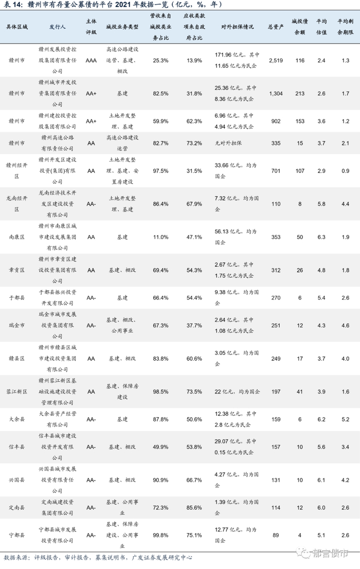 平台概况方面,赣州市平台数量较多,有25家存量债平台,其中市级平台7家,区县级平台15家,国家级园区平台2家,其他园区平台1家。赣州市级平台包括赣州发展投资控股集团有限责任公司(“赣州发投”)、赣州城市开发投资集团有限责任公司(“赣州城投”)、赣州建控投资控股集团有限公司(“赣州建控”)、赣州高速公路有限责任公司(“赣州高速”)、赣州振兴实业有限责任公司(“振兴实业”)、赣州市国有资产投资集团有限公司(“赣州国投”)、赣州民晟实业投资有限责任公司,其中后3家平台仅有存量私募债。并且,除了赣州建控和赣州国投外,其余平台均在赣州发投体系内。