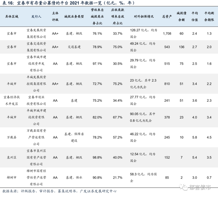 宜春发投是宜春市资产规模最大的主平台,主要负责基础设施建设、棚改等业务。2021年实现营业收入45.24亿元,城投类业务收入占比达76.1%,另外还有少量房地产开发、房屋租赁、贸易等业务收入。公司有息债务以银行贷款为主,2021年末占比61.4%,并且非标占比较低。公司对外担保规模较大,截至2022年3月末,对外担保余额为126.27亿元,但占净资产比例处于17.77%的较低水平,并且被担保对象均为国企。公司存量债平均估值较低,仅为2.4%,平均剩余期限1.3年。