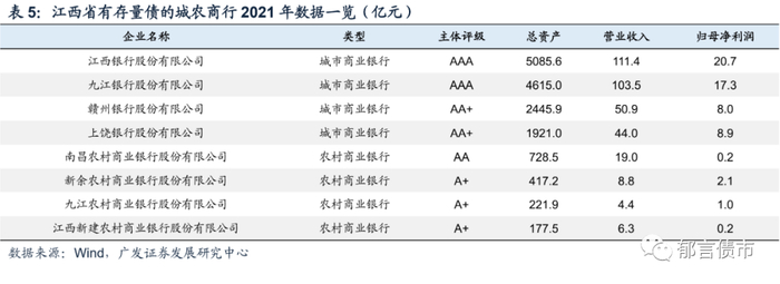 截至2022年9月23日,江西省90家城农商行中8家有存量债,其中江西银行和九江银行为上市公司。截至2021年末,江西银行和九江银行总资产分别为5085.6亿元和4615.0亿元,两家银行总资产合计近万亿元。其中江西银行是江西省唯一的省级城商行,也是江西省首家上市的金融企业。