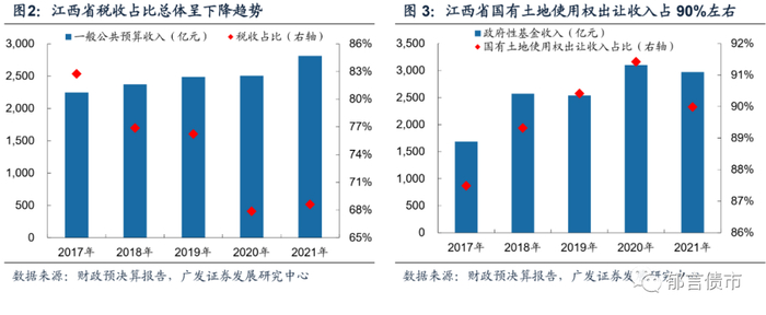 财政方面,江西省2021年实现一般公共预算收入2812亿元,排全国第15位;一般公共预算收入增速为12.2%,排全国第9位;税收收入占比68.6%。江西省2021年政府性基金收入为2972亿元,同比下降4.2%,其中国有土地使用权出让收入为2674亿元,占比90%。