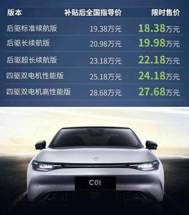 9月28日晚,零跑汽车最新旗舰车型——零跑C01正式上市。零跑C01定位为多场景智能豪华电动轿车,共推出后驱标准续航版、后驱长续航版、后驱超长续航版、四驱双电机性能版、四驱双电机高性能版五大版本,补贴后全国指导价分别为19.38万元、20.98万元、23.18万元、25.18万元、28.68万元。