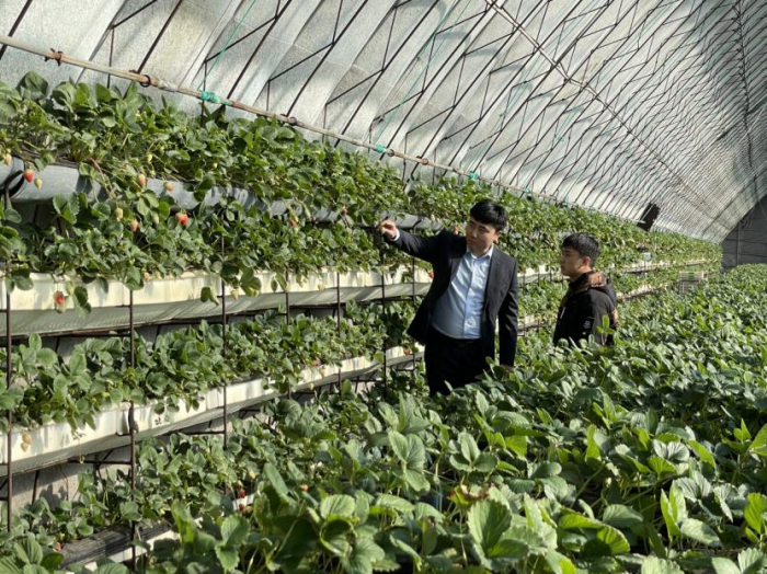 辽宁丹东东港支行在东港市北井子镇绿源生态养殖家庭农场现场考察。企业长久以来受困于无合格押品、或押品不足值的问题,东港支行抢抓东港市政府为农业设施确权办证的契机,向企业创新开办了“草莓农业设施抵押贷款”,累计投放980万元。