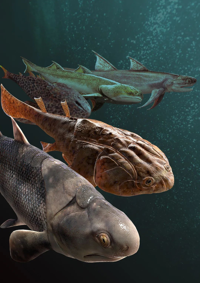 ▲中国志留纪早期(兰多维列世,约4.4亿年前)五种古鱼的三维复原 (黔齿鱼,梵净山鱼,土家鱼,秀山鱼,沈氏棘鱼,自上而下)