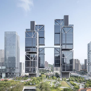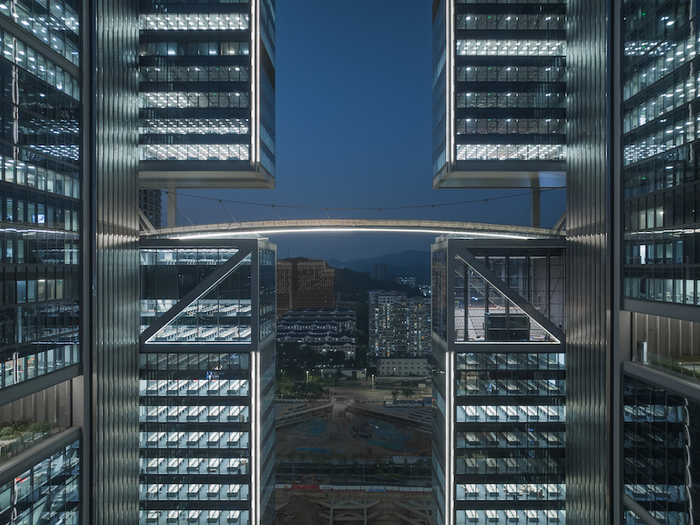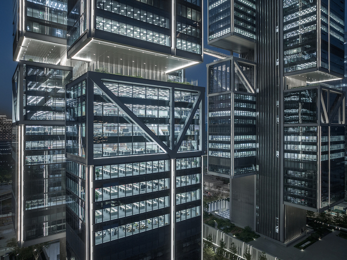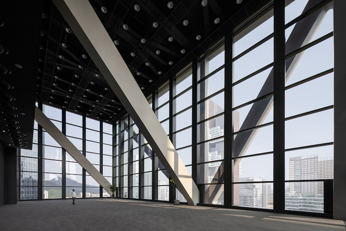 这是国际首例200米以上非对称悬挂全钢结构超高层建筑,两栋塔楼的办公和研发区都是通过巨型桁架和圆截面钢吊柱悬挂在空中的,这样的结构让大跨度的室内空间可以不设立柱,创造出无间断的270°玻璃幕墙景观视野。建筑内设有四层高的无人机飞行测试实验室——用以测试和较准研发中的新产品。在悬浮体块的顶部有空中花园,工作人员可以在享受舒适的休憩空间。在城市天际线的衬托下,所有钢结构都暴露在外,赋予了塔楼鲜明的外观。