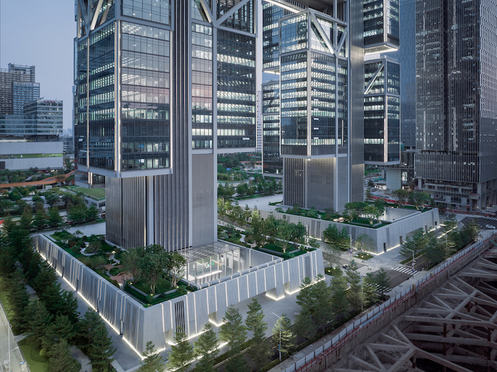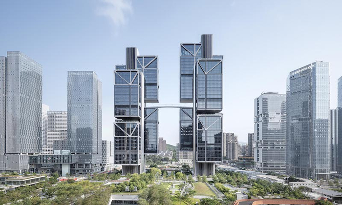深圳市南山区,两栋新建高楼在绿荫环绕间拔地而起,在结构柱的支持下,大楼被整体抬离地面悬浮在空中,地面则拥有了更多绿意和公共空间。这正是大疆(DJI)的全球总部“天空之城”。