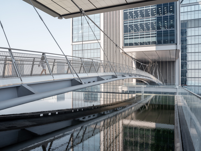 两栋塔楼在距地面110米高处由一座“空中连桥”相连,像是飘落在两棵树之间的一根羽毛,“空中连桥”采用轻盈的拉索结构:跨度76米,总长90米,优雅地将两栋塔楼连在一起。