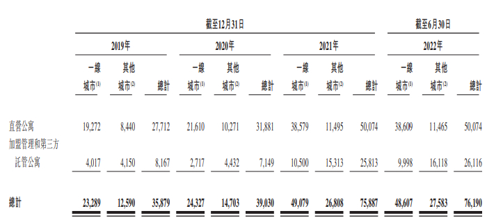 截至2022年6月30日,公司在26座城市的394个地点经营76190套在营公寓,其中直营公寓有50074套,加盟管理和第三方托管公寓有26116套。