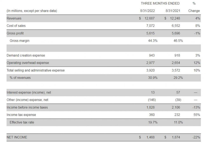 中新经纬消息,29日盘后,耐克公司公布2023财年第一财季业绩报告称,截至2022年8月31日的三个月内,耐克收入126.87亿美元,同比增长4%;净利润为14.68亿美元,同比下滑22%。