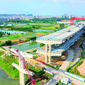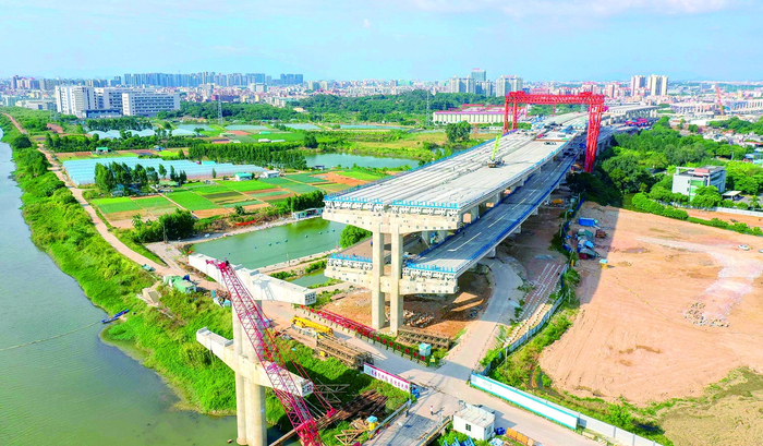 为减少征地拆迁、节约建设用地,中铁大桥局承建的莞(东莞)番(番禺)高速公路三期优化设计,大量采用共线双层桥结构,上层是莞番高速,中层是环莞快速,地面为镇街公路,全线比单层桥方案减少占地53公顷。图为莞番高速双层桥架梁施工现场。