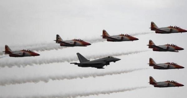 2016年7月31日,在西班牙滨海托雷举办的国际航空节上,一架欧洲战斗机(中)和西班牙空军特技飞行队进行表演。图源:新华社
