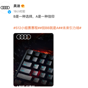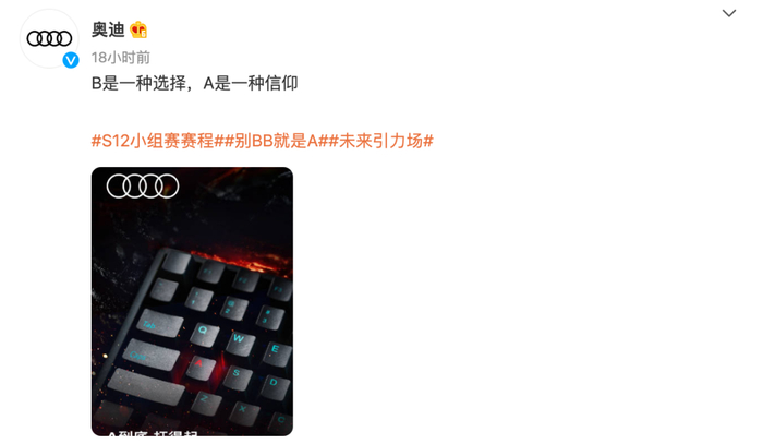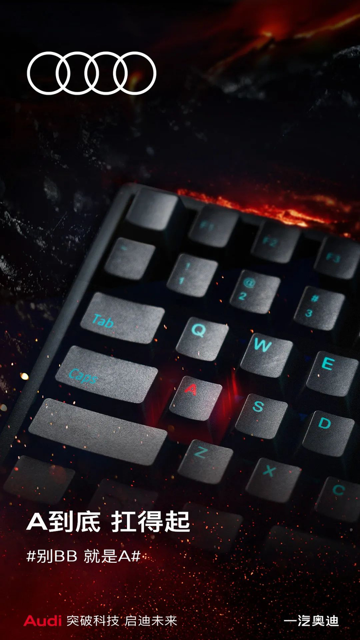 9月29日,奥迪在微博发文,“B是一种选择,A是一种信仰”,同时配上一张极具内涵的海报图。海报显示,键盘局部着重标注出字母A,同时搭配“A到底,扛得起”以及“别BB,就是A”的字样。