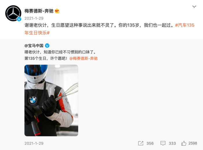 随后,宝马中国在其官微发文称,“嘿老伙计,知道你已经不习惯别的口味了。第135个生日,许个愿吧!”宝马中国的这条微博是很有深意的,配图为一个车手拿着搅拌器,这是要给奔驰做蛋糕的节奏啊!随后,奔驰转发微博回应称,“谢谢老伙计,生日愿望这种事说出来就不灵了。你的135岁,我们也一起过。”不得不说,字里行间确实能够感受到奔驰宝马之间深厚的情谊。