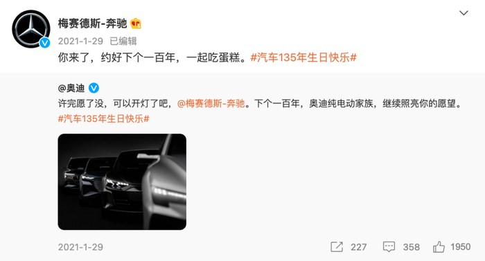 奥迪自然也是坐不住了,随后奥迪发布微博,“许完愿了没,可以开灯了吧。下个一百年,奥迪纯电动家族,继续照亮你的愿望。”其微博内容的意思大概就是,宝马做完蛋糕,奔驰吹完蜡烛,奥迪也该开灯了。梅赛德斯-奔驰同样转发微博表示,“你来了,约好下个一百年,一起吃蛋糕。”有网友表示,奥迪真不愧是灯厂。还有网友为奥迪委屈,难道这一次连吃的份都没有吗?还要等下一个一百年?
