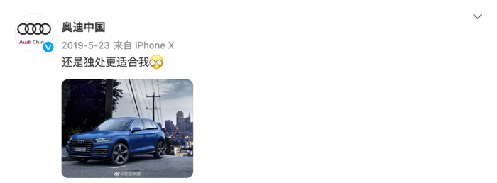 奔驰宝马惺惺相惜,奥迪却略显孤独。最后,奥迪还是忍不住,以“受害者的身份”在微博上表示:“还是独处更适合我。”