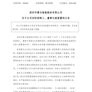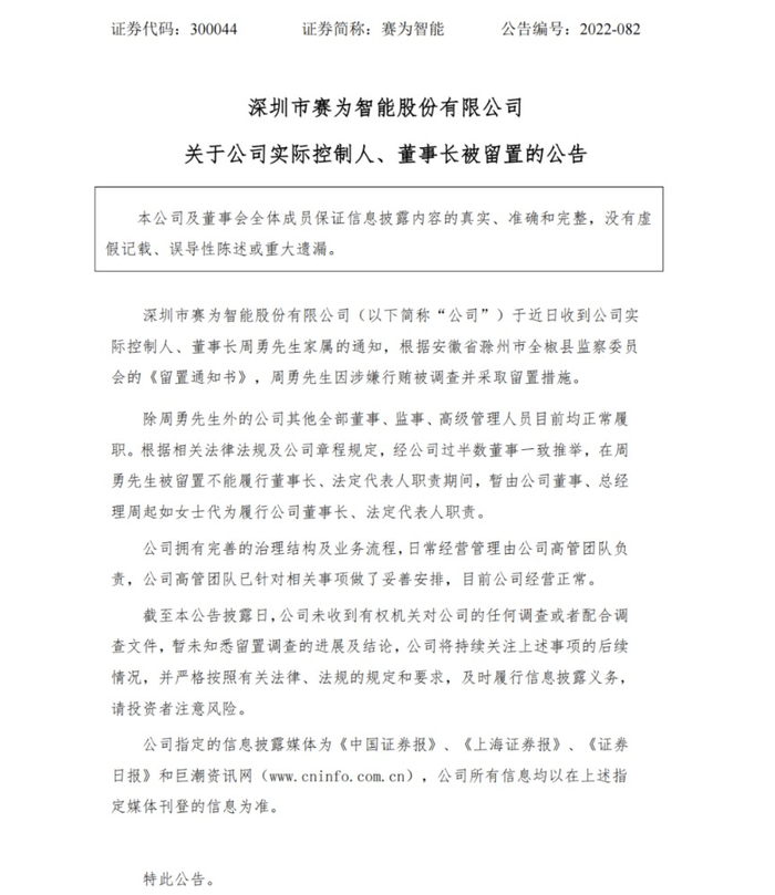 9月30日晚间,赛为智能披露公告称,公司于近日收到公司实际控制人、董事长周勇先生家属的通知,根据安徽省滁州市全椒县监察委员会的《留置通知书》,周勇先生因涉嫌行贿被调查并采取留置措施。对此,深交所已火速下发《关注函》。