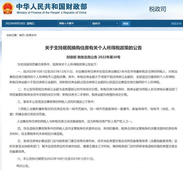首先是财政部、税务总局两部门联合发文,2023年底前居民换购住房可享个税退税优惠。